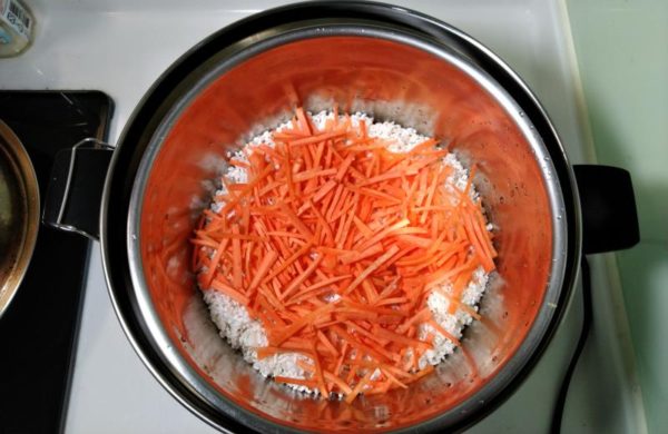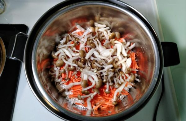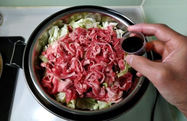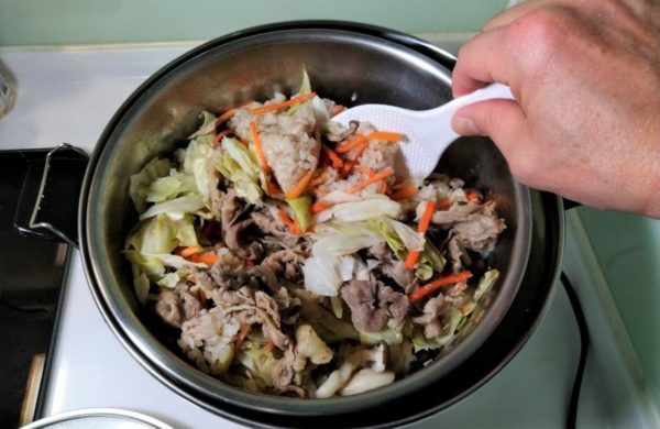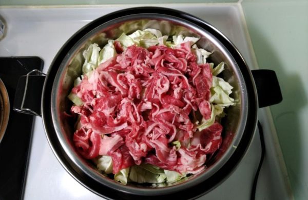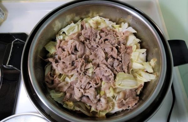 ▼次にニンジン、しめじ、キャベツの順番でレイヤーを重ね、その上にお好みの大きさに切ったお肉をのせましょう。