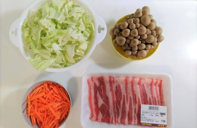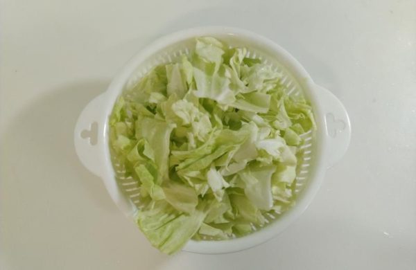 ▼キャベツは洗ってざく切り、ニンジンは細切りにします。