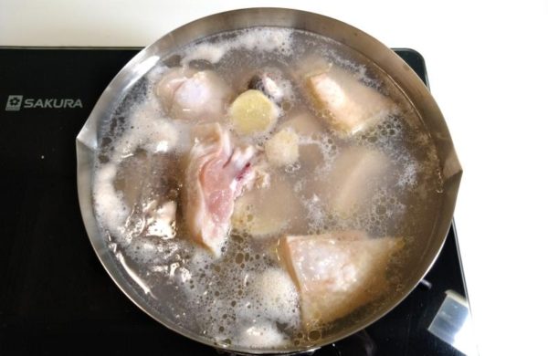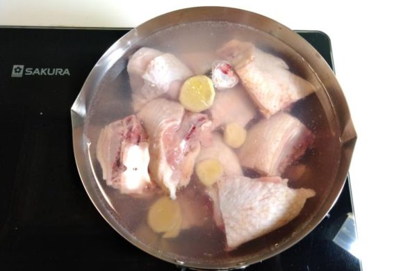▼鍋に鶏肉、生姜4~5片、お酒と水を入れて火にかけ、沸騰したらアクを取ります。