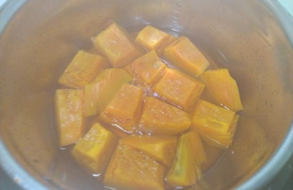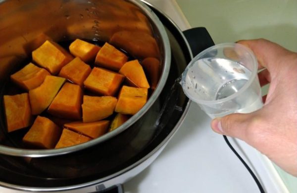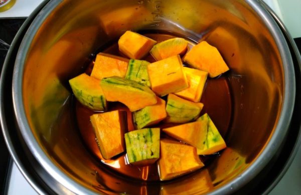 ・内鍋にかぼちゃ全部、外鍋には水180ml(お米カップ1)を投入して準備完了