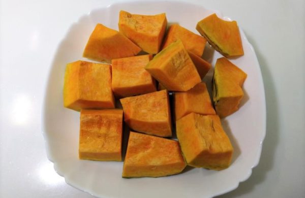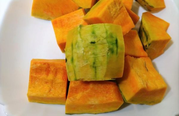 ▼はじめに、かぼちゃのタネ、ワタをスプーン等でくり抜いてから、5~6㎝程度の角切りにします。そのままでも構いませんが、皮が苦手な方は写真のように削ぎ落してもオッケーです。