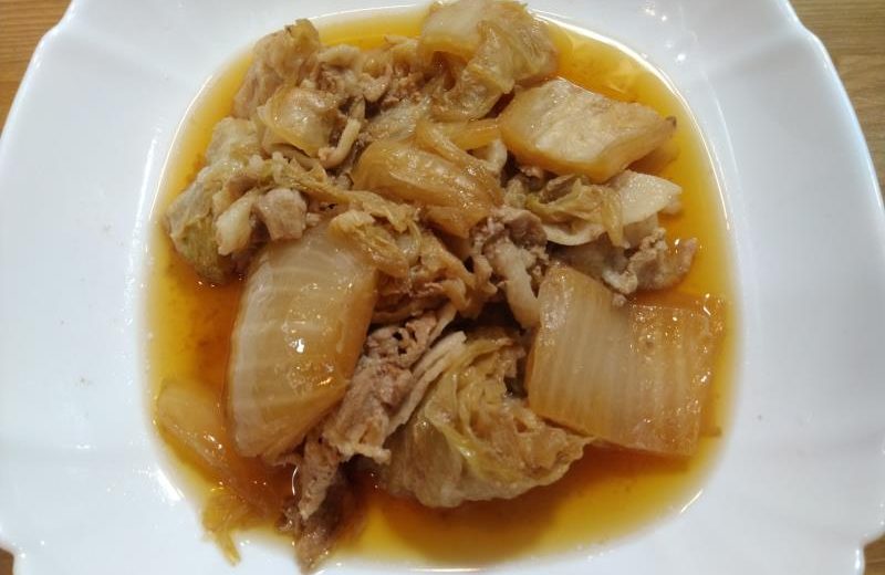 あとはお皿に盛り付けて完成です。ここにジャガイモが入ったら、肉じゃがのようにも見えますが、味は酸白菜の酸味が効いた味になっています。ポン酢で食べる豚しゃぶにも似て、ご飯が進む味ですよ。