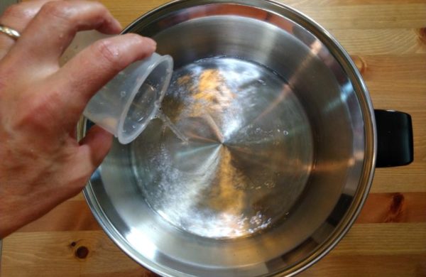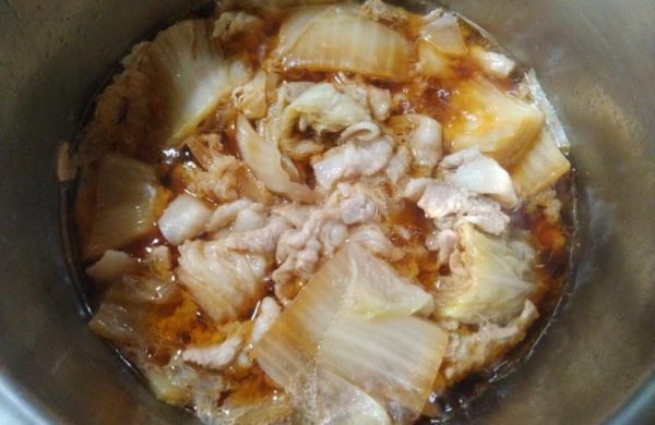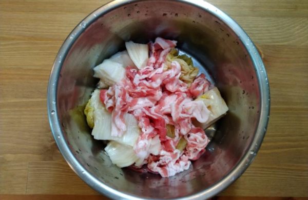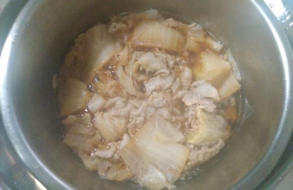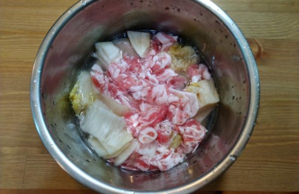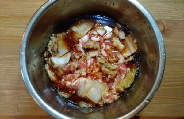 ▼ステップ1の酸白菜と豚肉を内鍋に入れ、そこに食材がちょうど浸かる程度にお水を入れたら、さらに醤油40mlを入れて良く混ぜます(我が家には小さい子供がいるので、あえて入れていませんが、ここで鷹の爪を1本入れるのもアリです)。