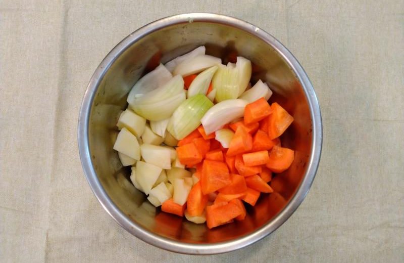 ▼じゃがいも、にんじん、玉ねぎ、豚肉を適当なサイズに切ります。おすすめの切り方は、じゃがいも、にんじんは乱切り、玉ねぎは串切りです。