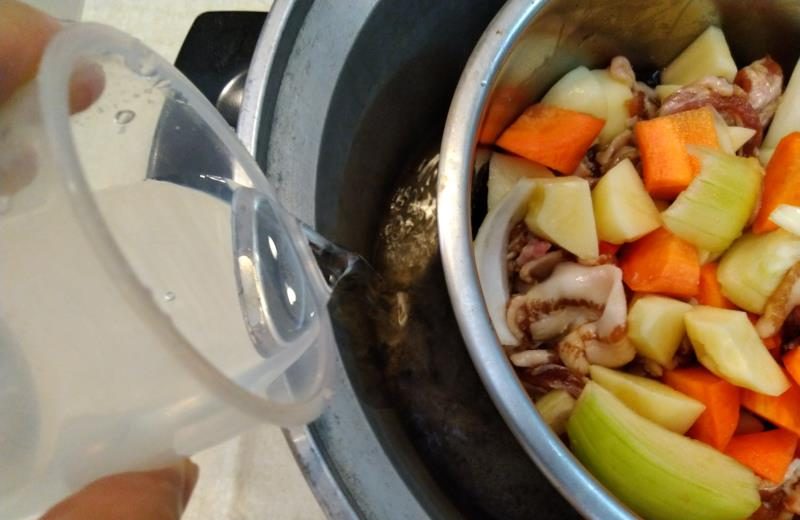 ▼内鍋に野菜、肉を漬け汁ごと全部投入したら、だし汁220mlを加えて軽く混ぜます。