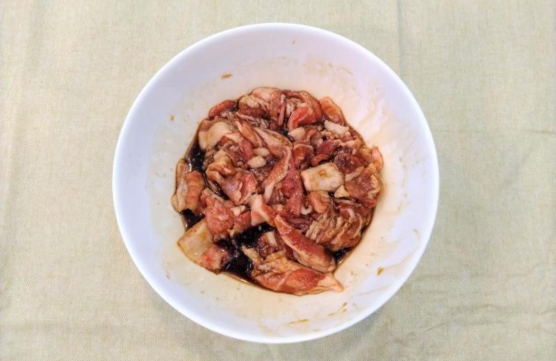 ▼醤油、みりん各30mlと砂糖大さじ2をボウルに入れ、よくかき混ぜたら、豚肉を投入して5~10分ほど漬け込みます。