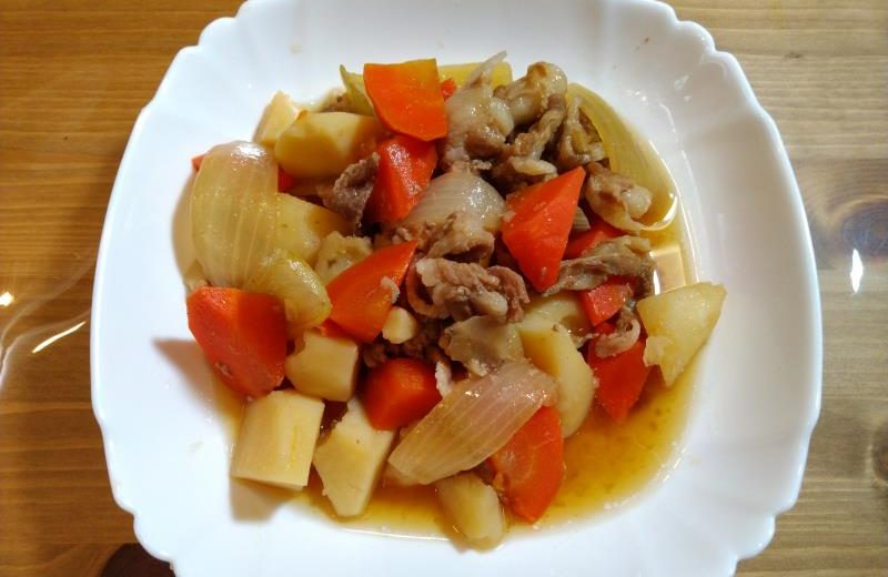 フタを開けて軽く混ぜたら、あとはお皿に盛り付けて完成です。電鍋の調理時間は30分ほどですが、じゃがいも、にんじんどちらもイイ感じでほっこり仕上がっています。